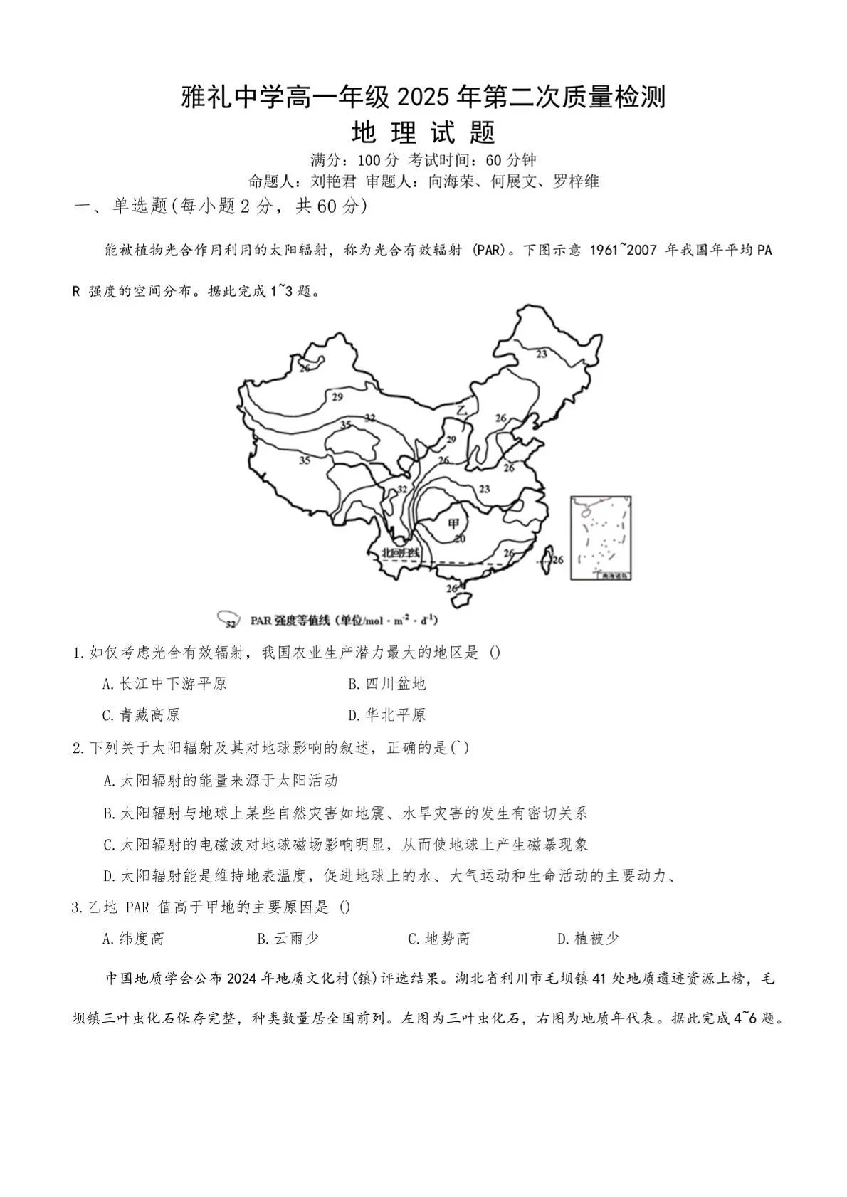 雅礼中学2025-2026学年高一上学期第二次质量检测 地理试题(含答案).pdf
