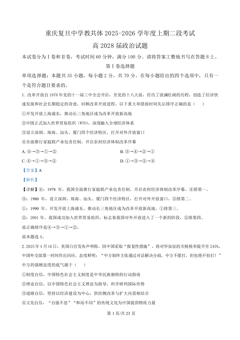 重庆市复旦中学教共体2025-2026学年高一上学期第二次段考 政治答案.docx