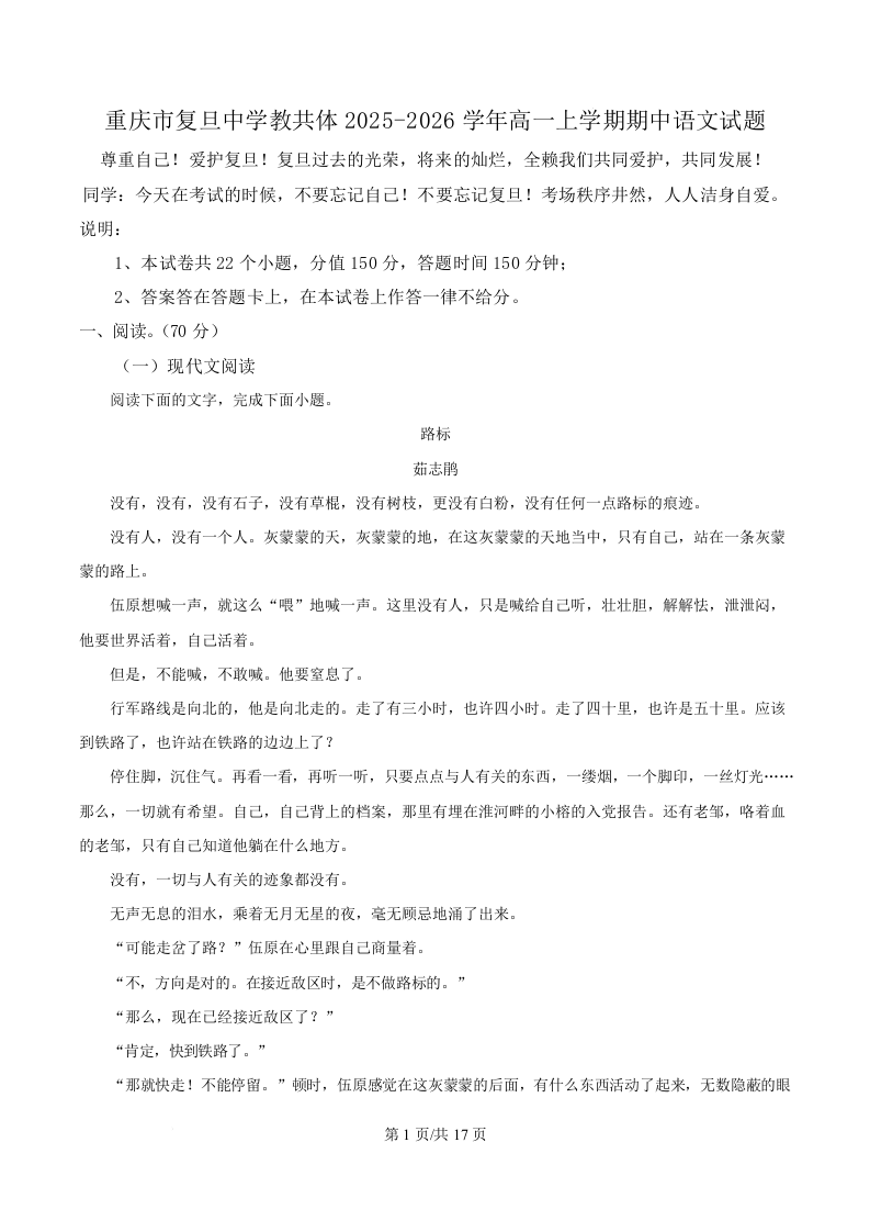 重庆市复旦中学教共体2025-2026学年高一上学期第二次段考 语文答案.docx