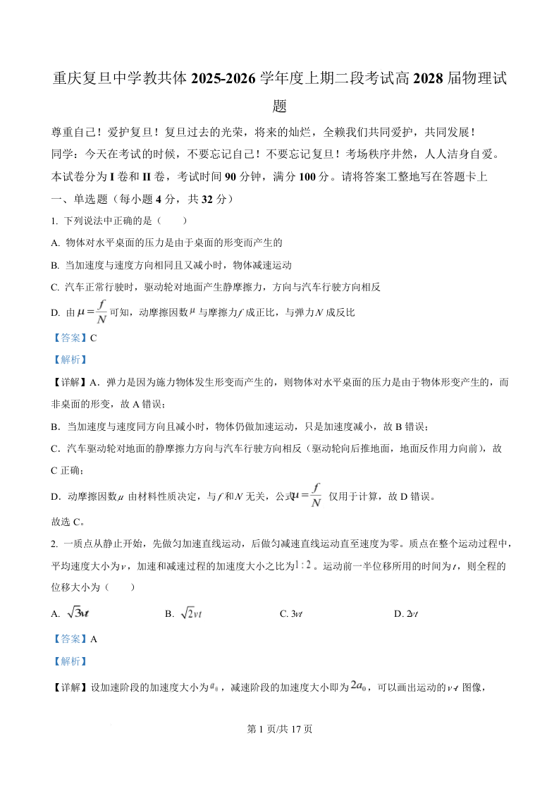 重庆市复旦中学教共体2025-2026学年高一上学期第二次段考 物理答案.docx