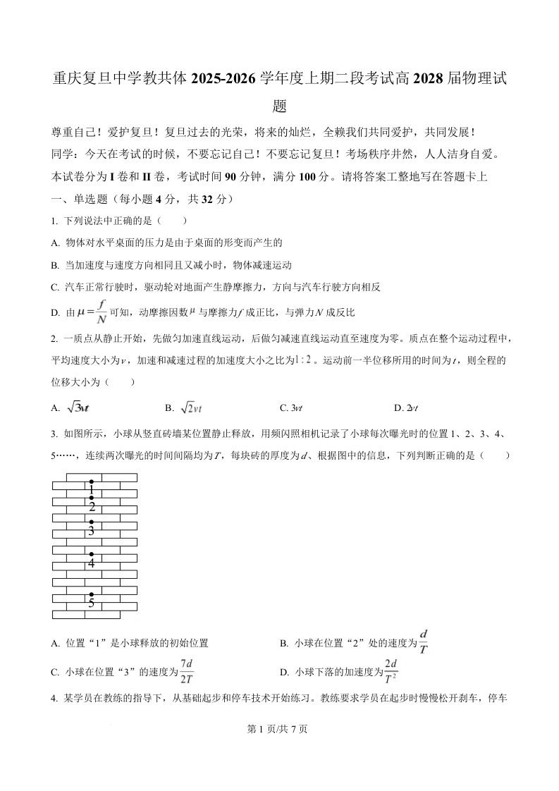 重庆市复旦中学教共体2025-2026学年高一上学期第二次段考 物理.docx
