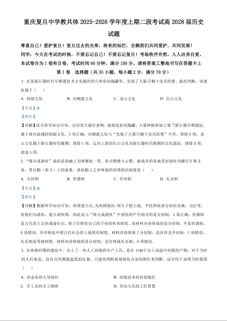 重庆市复旦中学教共体2025-2026学年高一上学期第二次段考 历史答案.docx