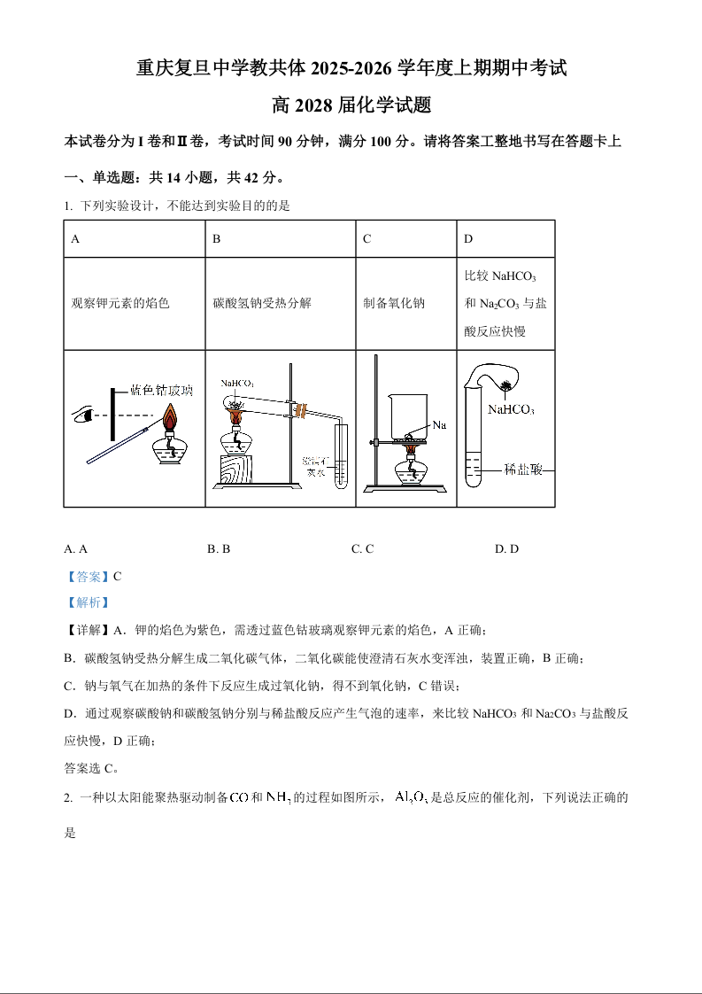 重庆市复旦中学教共体2025-2026学年高一上学期第二次段考 化学答案.docx