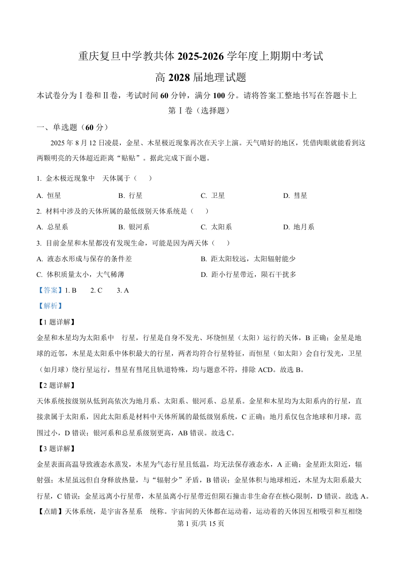 重庆市复旦中学教共体2025-2026学年高一上学期第二次段考 地理答案.docx