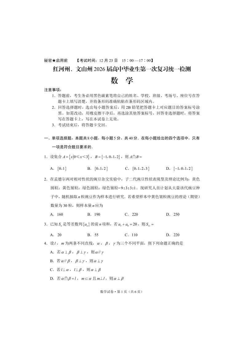 红河州、文山州2026届高中毕业生第一次复习统一检测 数学.pdf