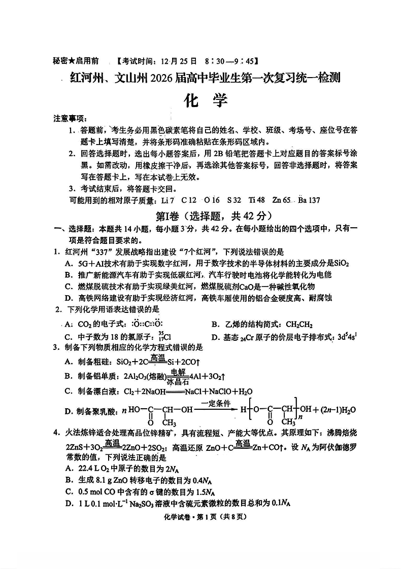 红河州、文山州2026届高中毕业生第一次复习统一检测 化学.pdf