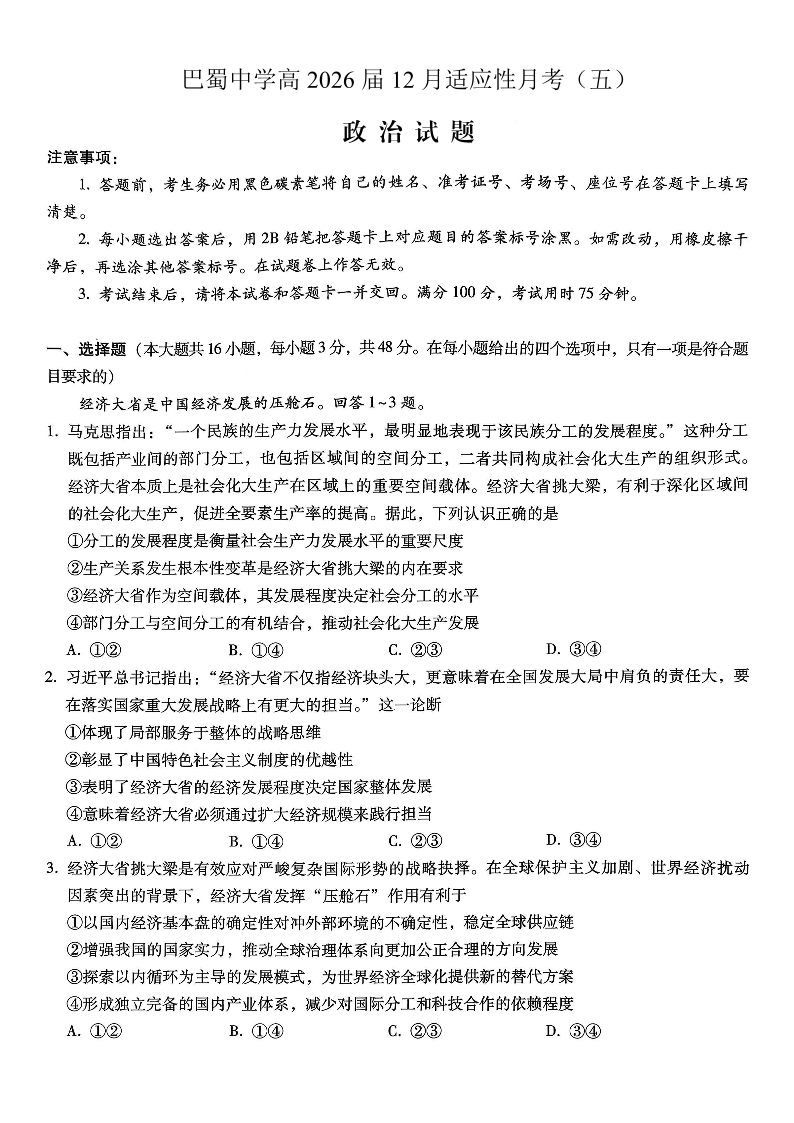 重庆市巴蜀中学2026届高考适应性月考卷(五)政治.pdf