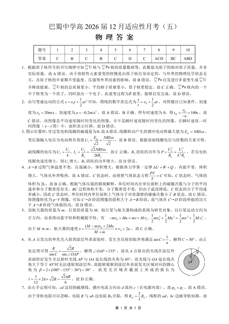 重庆市巴蜀中学2026届高考适应性月考卷(五)物理答案.pdf