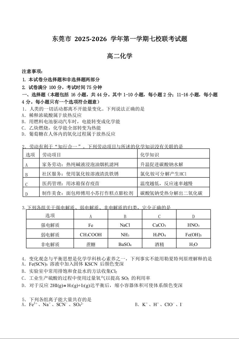 广东省东莞市七校2025-2026学年高二上学期联考 化学试卷(含答案).docx