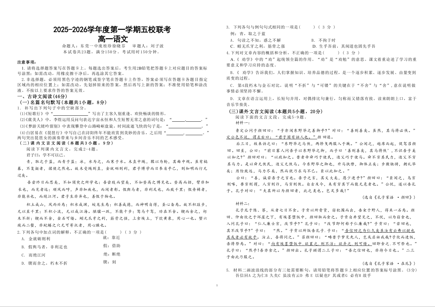 广东省东莞市2025-2026学年高一第一学期五校联考 语文试题(含答案).docx