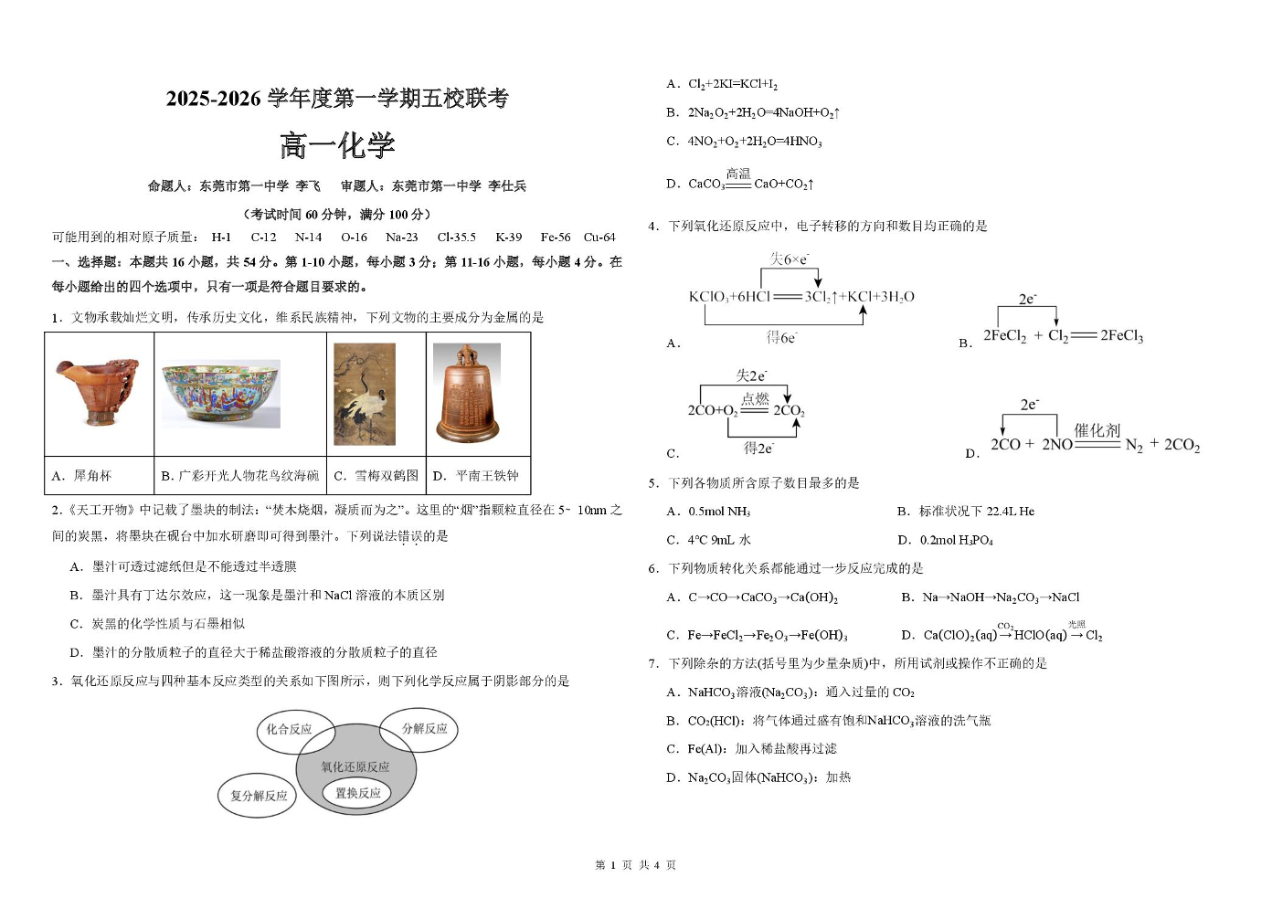 广东省东莞市2025-2026学年高一第一学期五校联考 化学试题(含答案).pdf