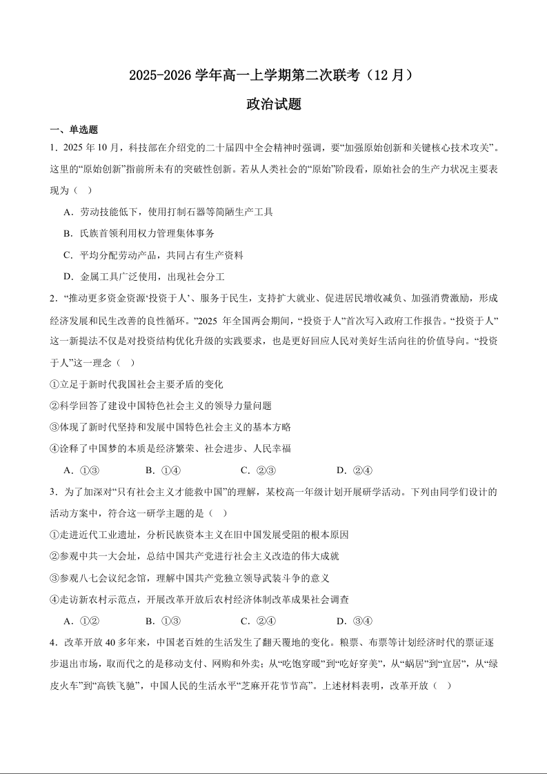 福建省泉州市晋江侨声中学、南安侨光中学2025年秋季高一年级两校联考二 政治试卷(含答案).docx