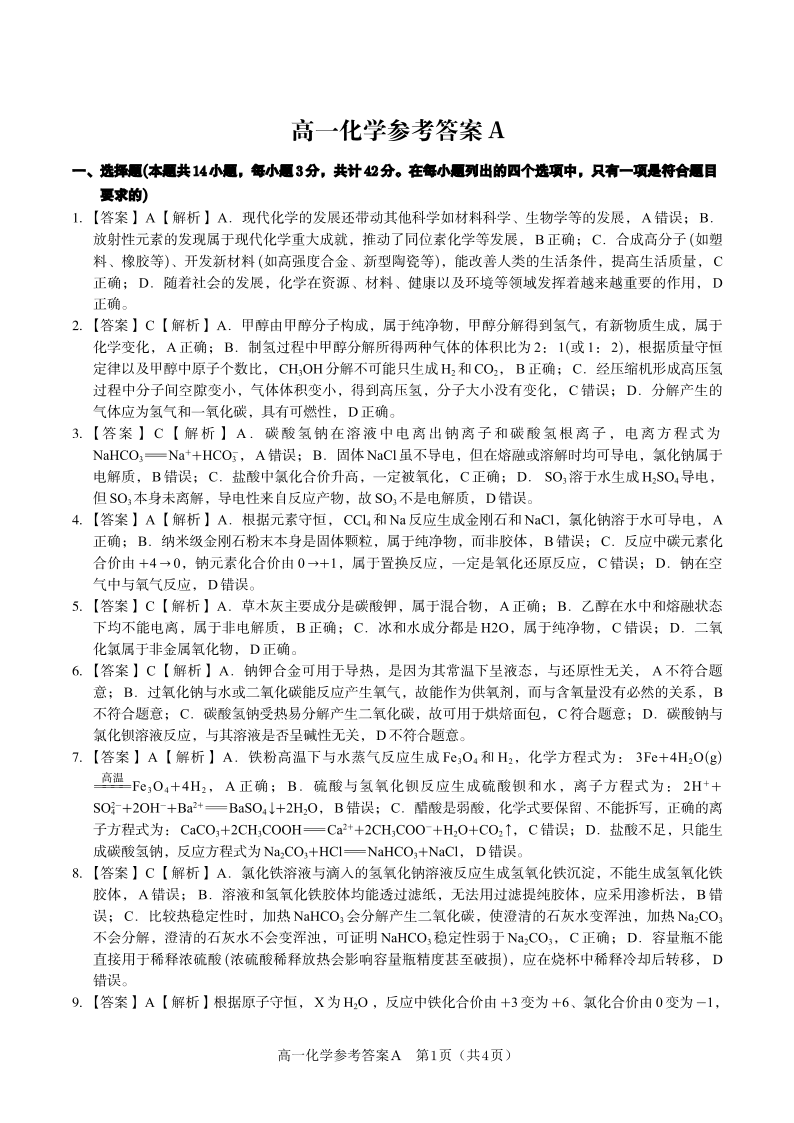 安徽省皖江名校联盟2025-2026学年高一上学期12月联考 化学(A卷)答案.pdf