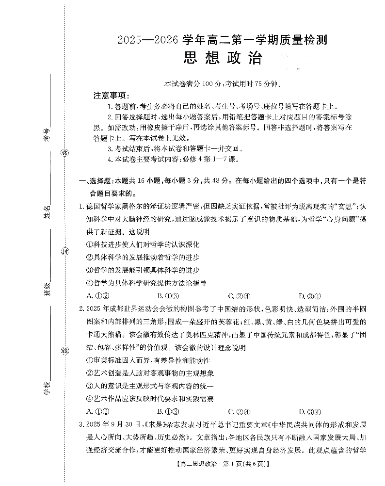 福建省南平市2025一2026学年高二年级第一学期质量检测 政治试题(含答案).pdf