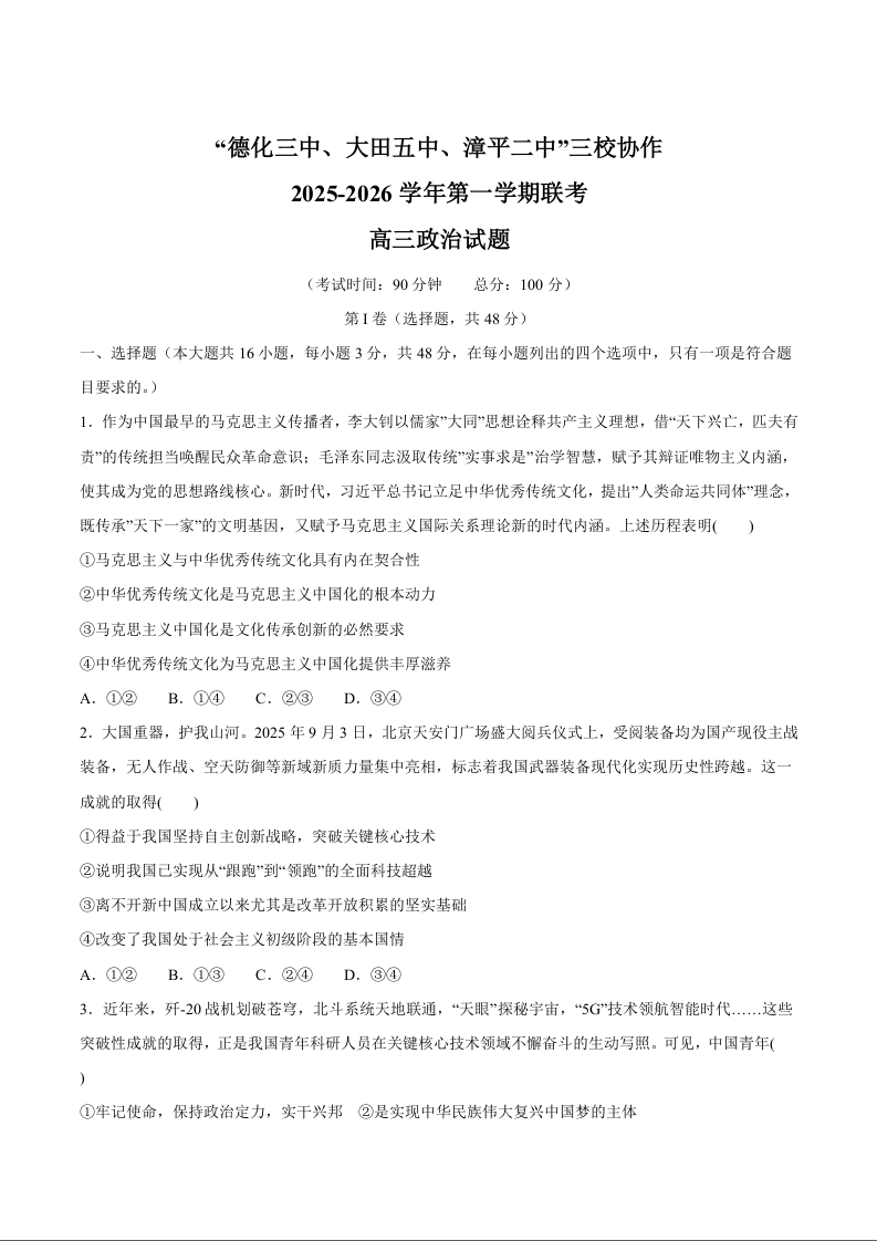 福建省龙岩市三校2025-2026学年高三第一学期12月联考 政治答案.docx