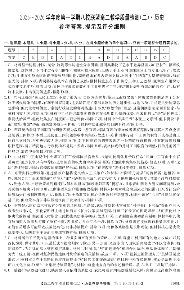 广东省·纵千文化2025~2026学年度第一学期八校联盟高二教学质量检测(二)历史答案.pdf