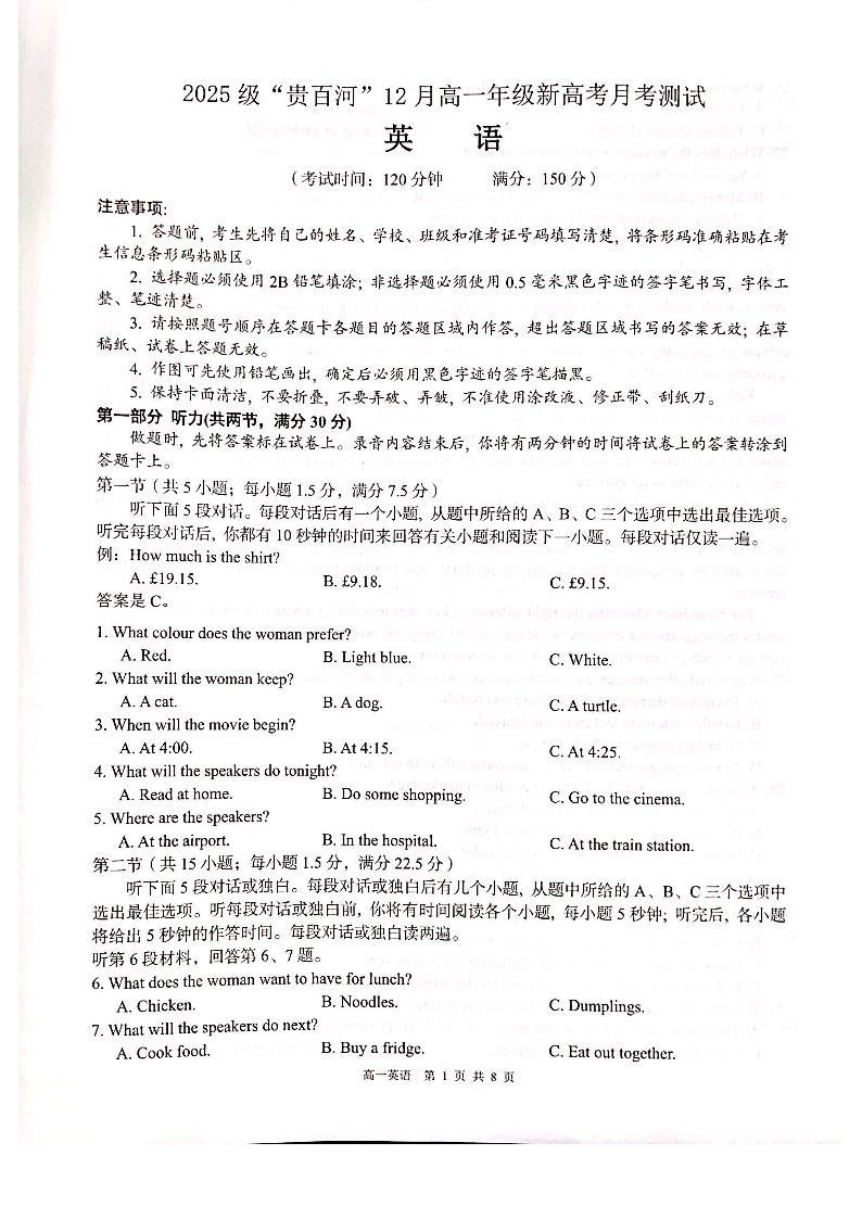 广西壮族自治区“贵百河”2025级12月高一年级新高考月考测试 英语.pdf