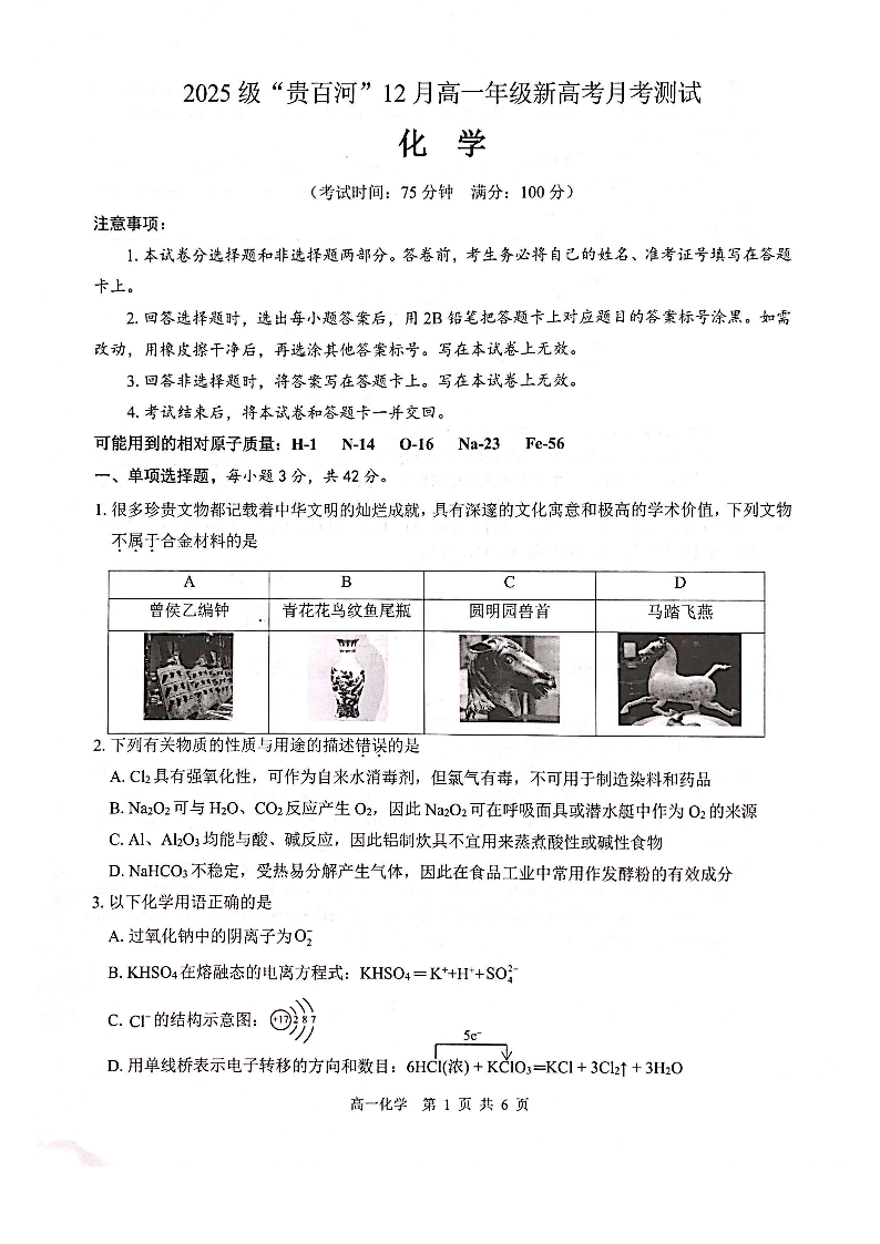 广西壮族自治区“贵百河”2025级12月高一年级新高考月考测试 化学.pdf