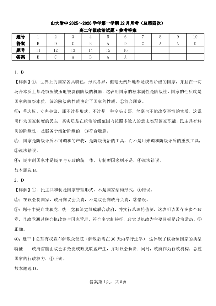 山西大学附中2025-2026学年第一学期高二(12月)月考(总第四次)政治答案.pdf