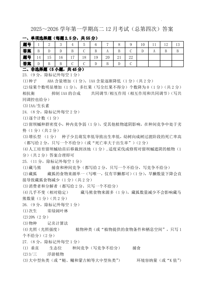 山西大学附中2025-2026学年第一学期高二(12月)月考(总第四次)生物答案.pdf