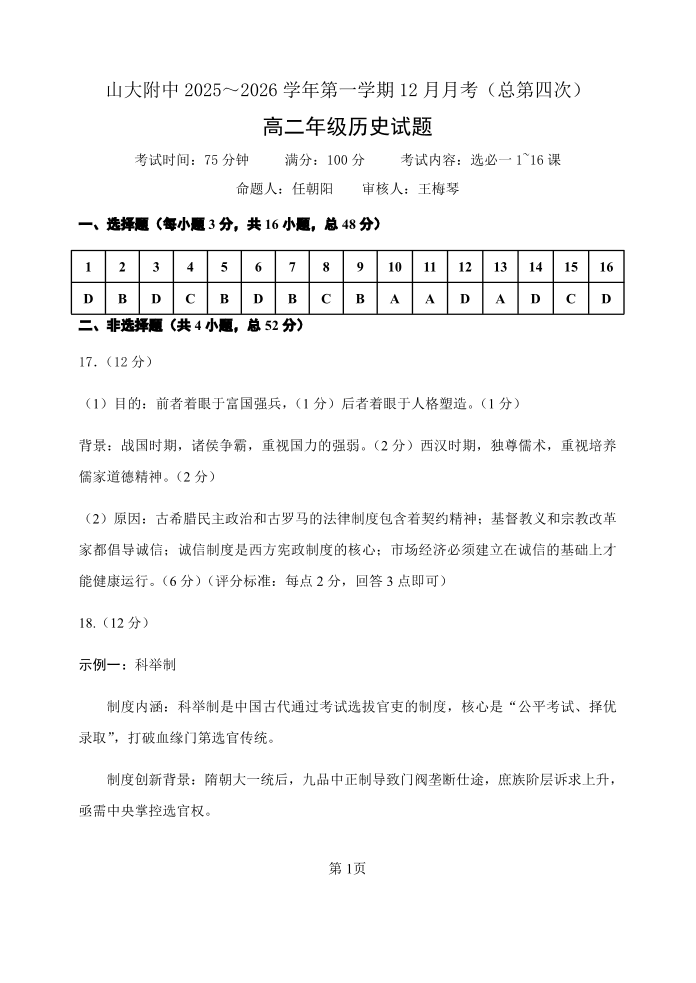 山西大学附中2025-2026学年第一学期高二(12月)月考(总第四次)历史答案.pdf