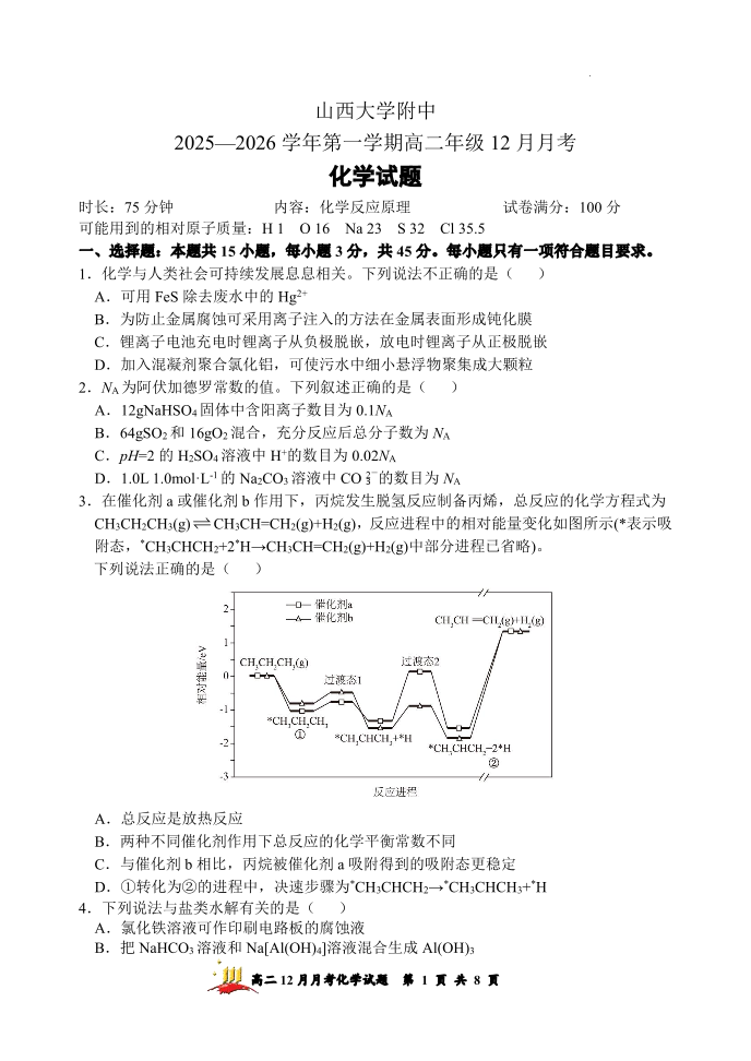 山西大学附中2025-2026学年第一学期高二(12月)月考(总第四次)化学.pdf