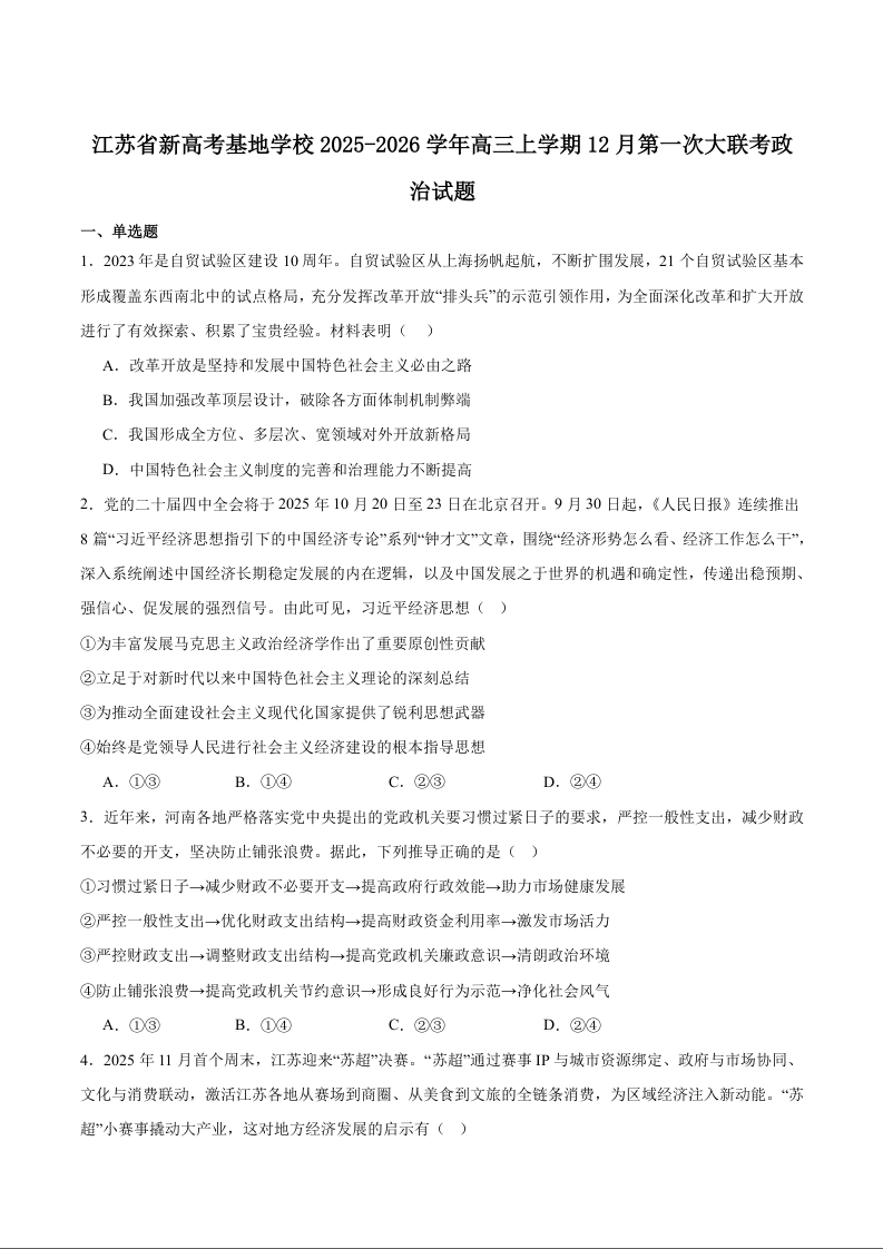 江苏省新高考基地学校2026届高三第一次大联考 政治试卷(含答案).docx