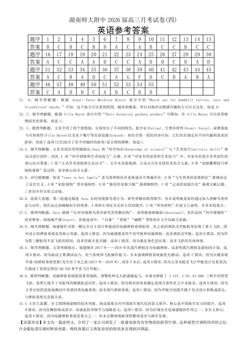 湖南师大附中2026届高三月考试卷(四)英语答案.docx