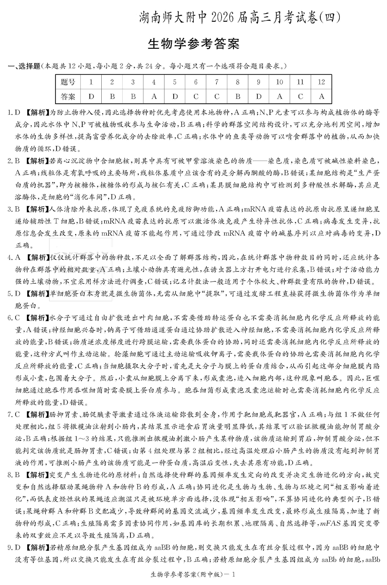 湖南师大附中2026届高三月考试卷(四)生物答案.pdf