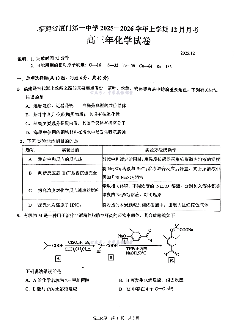 福建省厦门第一中学2025-2026学年度第一学期12月适应性练习 化学试题(含答案).pdf