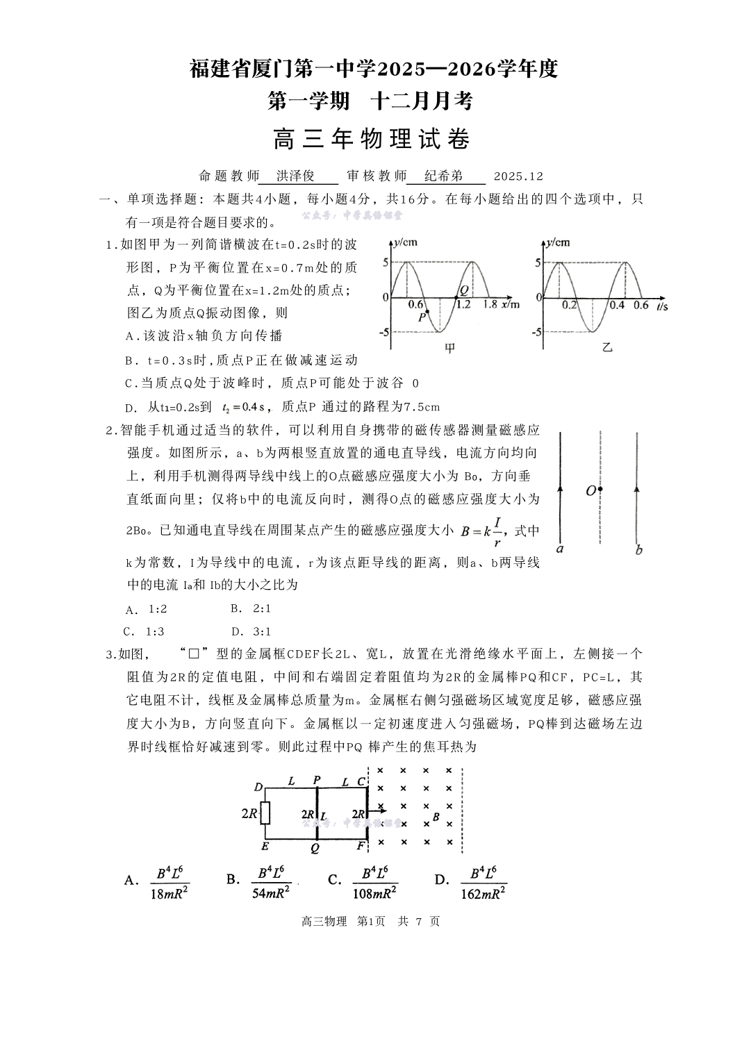 福建省厦门第一中学2025-2026学年度第一学期12月适应性练习 物理试题(含答案).pdf