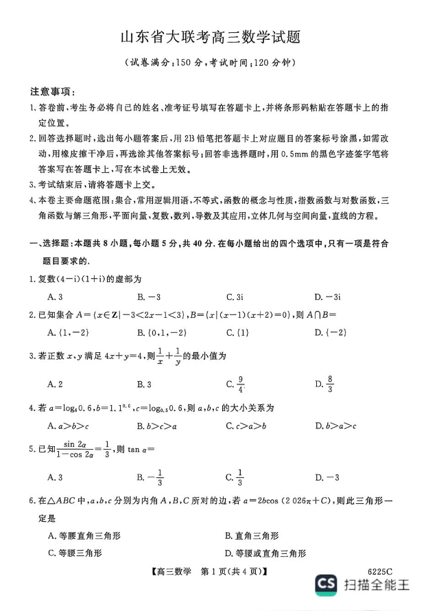 山东省大联考2025-2026学年高三上学期12月月考 数学试题(含答案).pdf