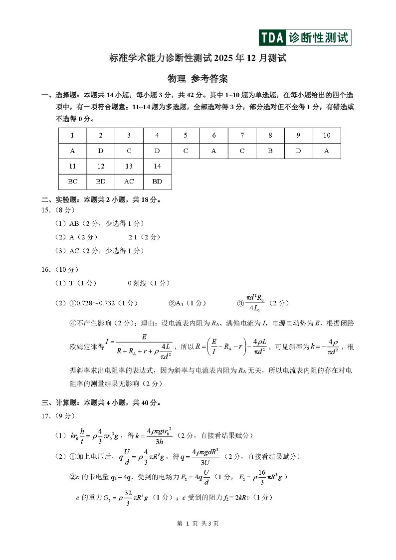 中学生标准学术能力(TDA)诊断性测试2025年12月高三测试 物理答案.pdf