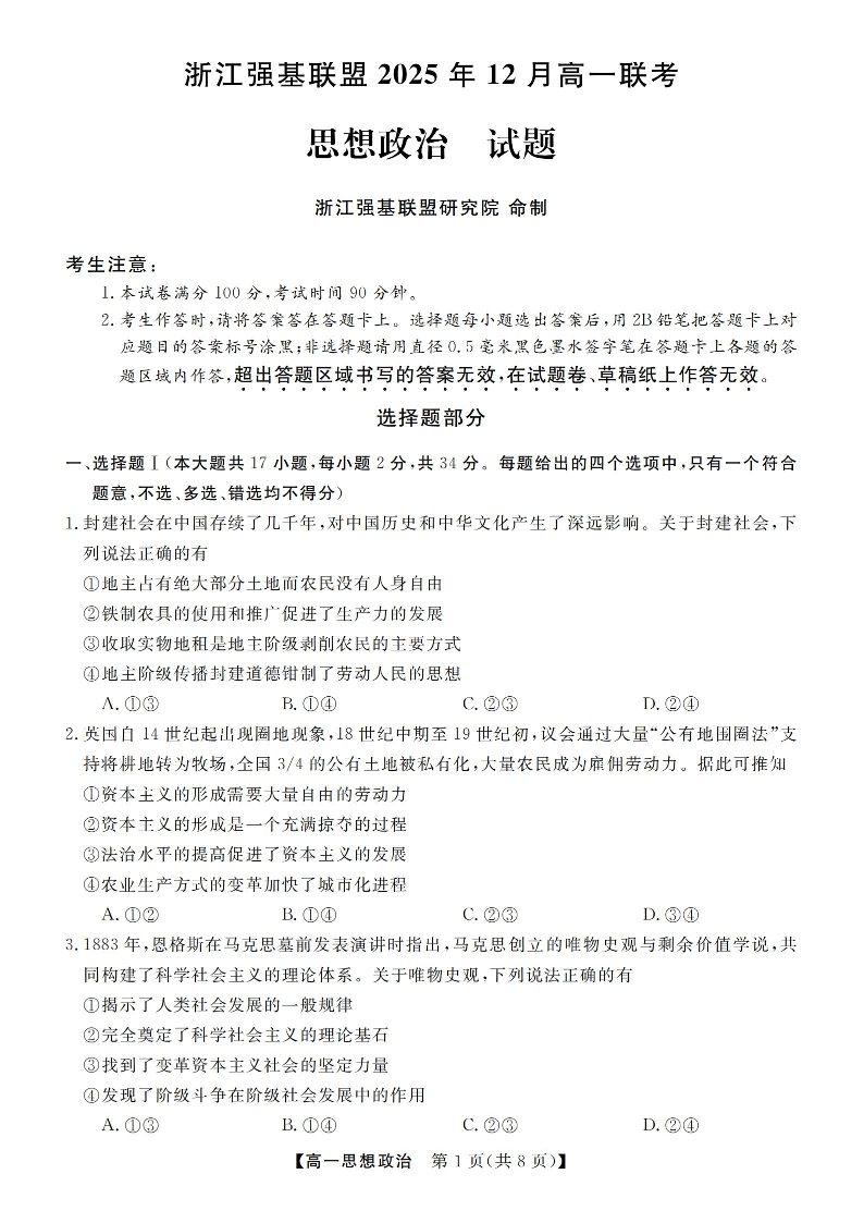 浙江省强基联盟2025年12月高一联考 政治.pdf