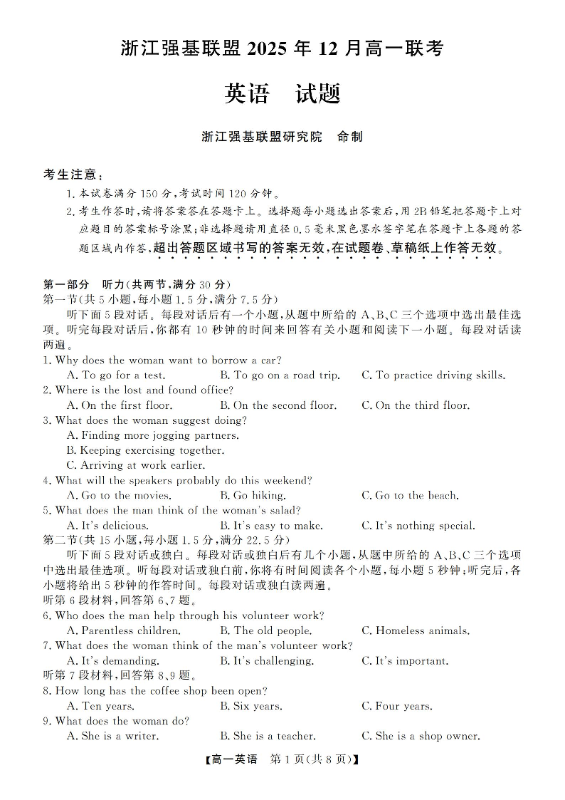 浙江省强基联盟2025年12月高一联考 英语.pdf