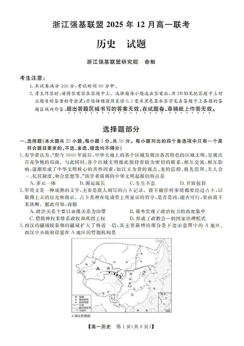 浙江省强基联盟2025年12月高一联考 历史.pdf
