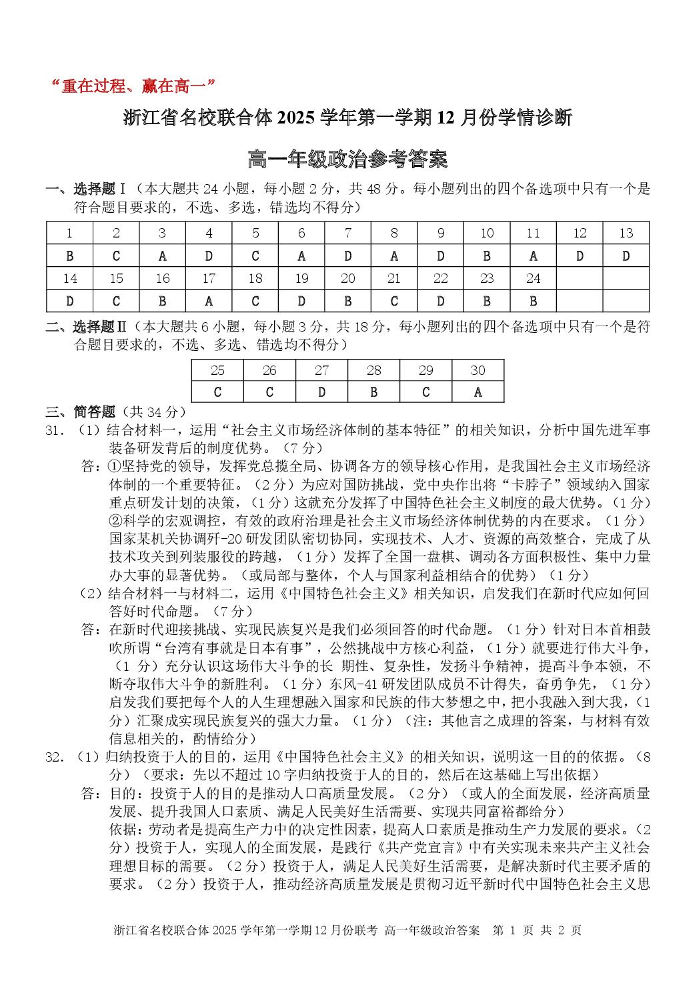 浙江省名校联合体2025学年高一上学期12月联考 政治答案.pdf