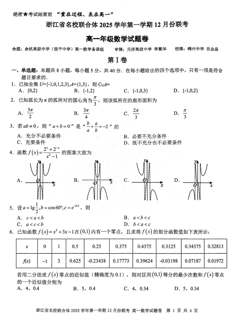 浙江省名校联合体2025学年高一上学期12月联考 数学.pdf
