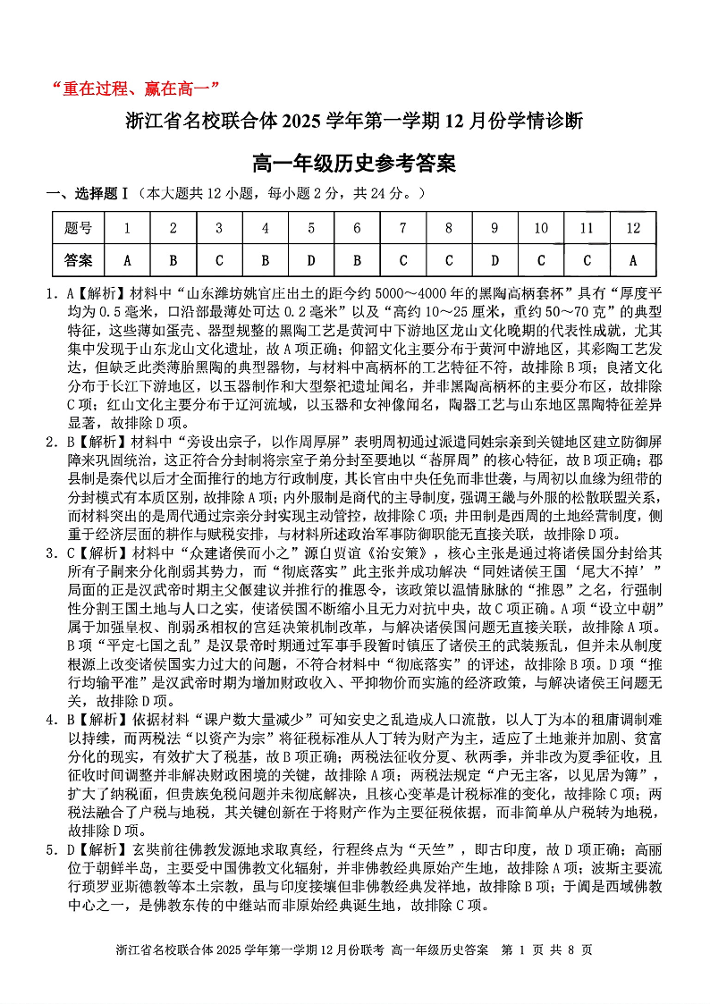 浙江省名校联合体2025学年高一上学期12月联考 历史答案.pdf