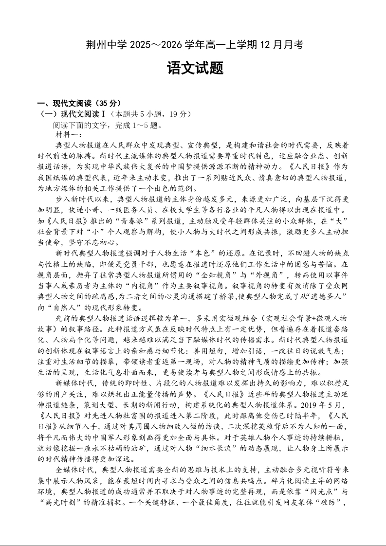 湖北省荆州中学2025-2026学年高一上学期12月月考 语文.docx