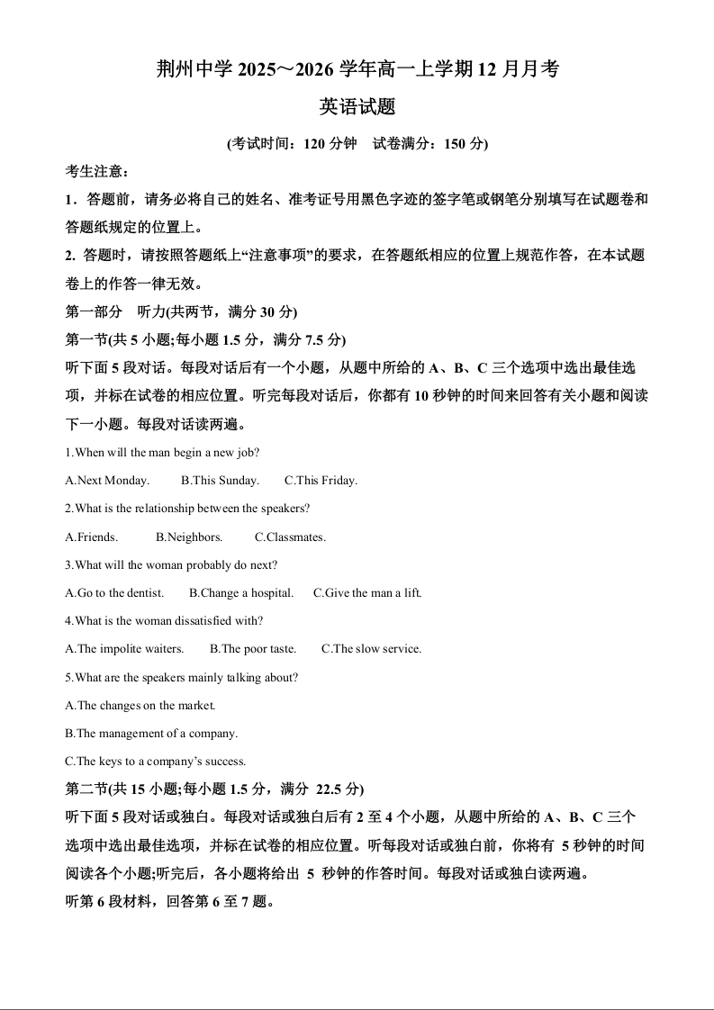 湖北省荆州中学2025-2026学年高一上学期12月月考 英语答案.docx