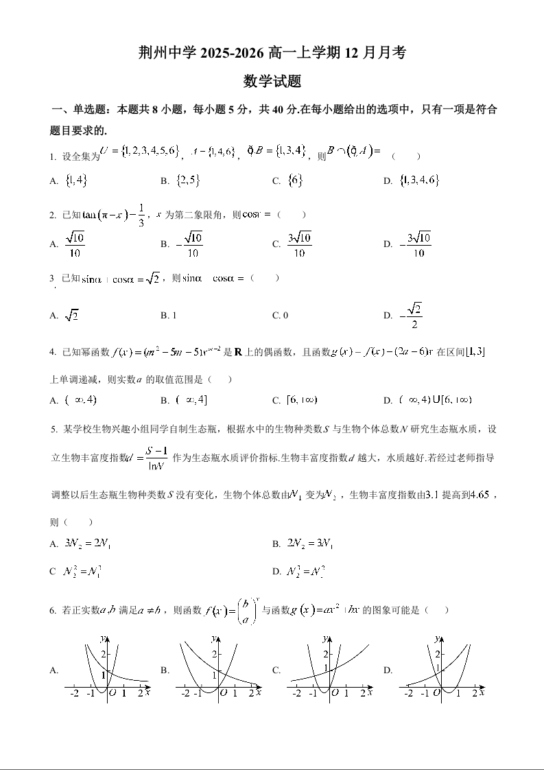 湖北省荆州中学2025-2026学年高一上学期12月月考 数学.docx