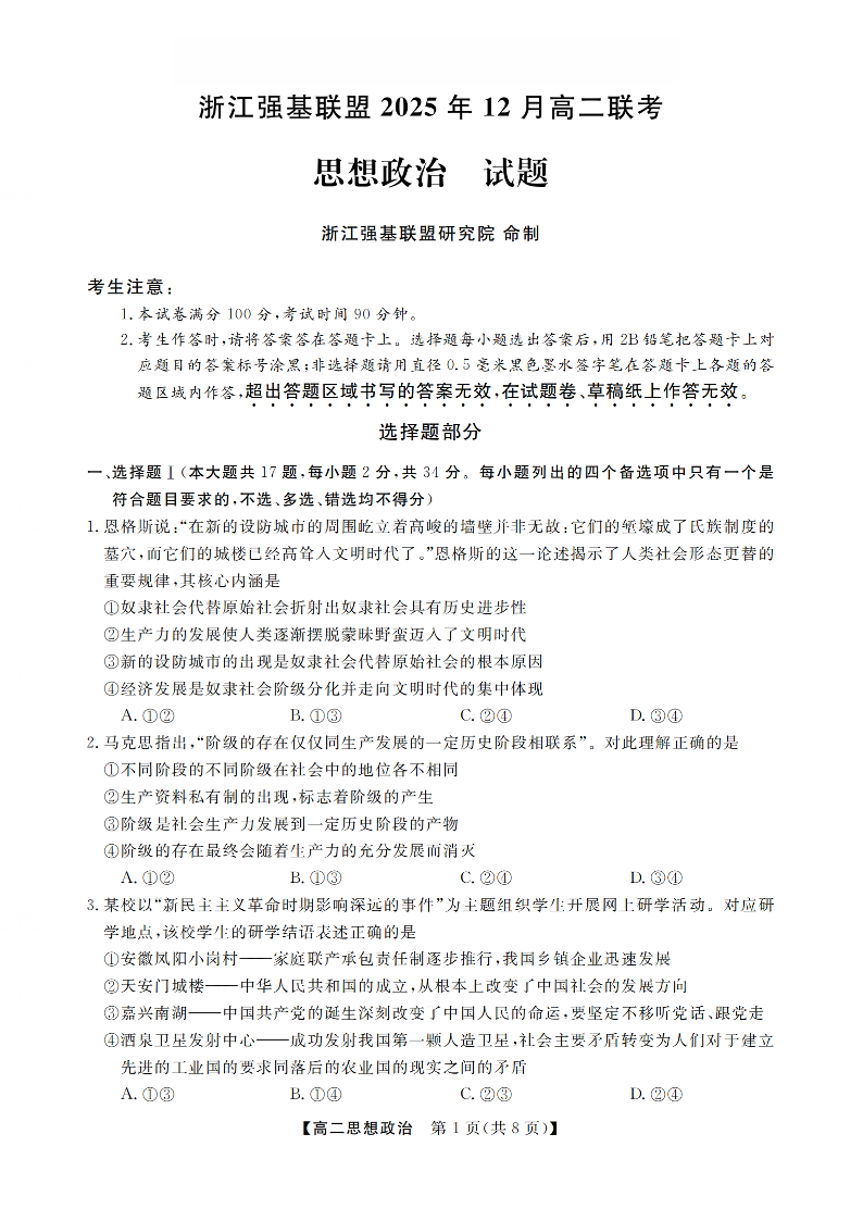 浙江省强基联盟2025年12月高二联考 政治.pdf