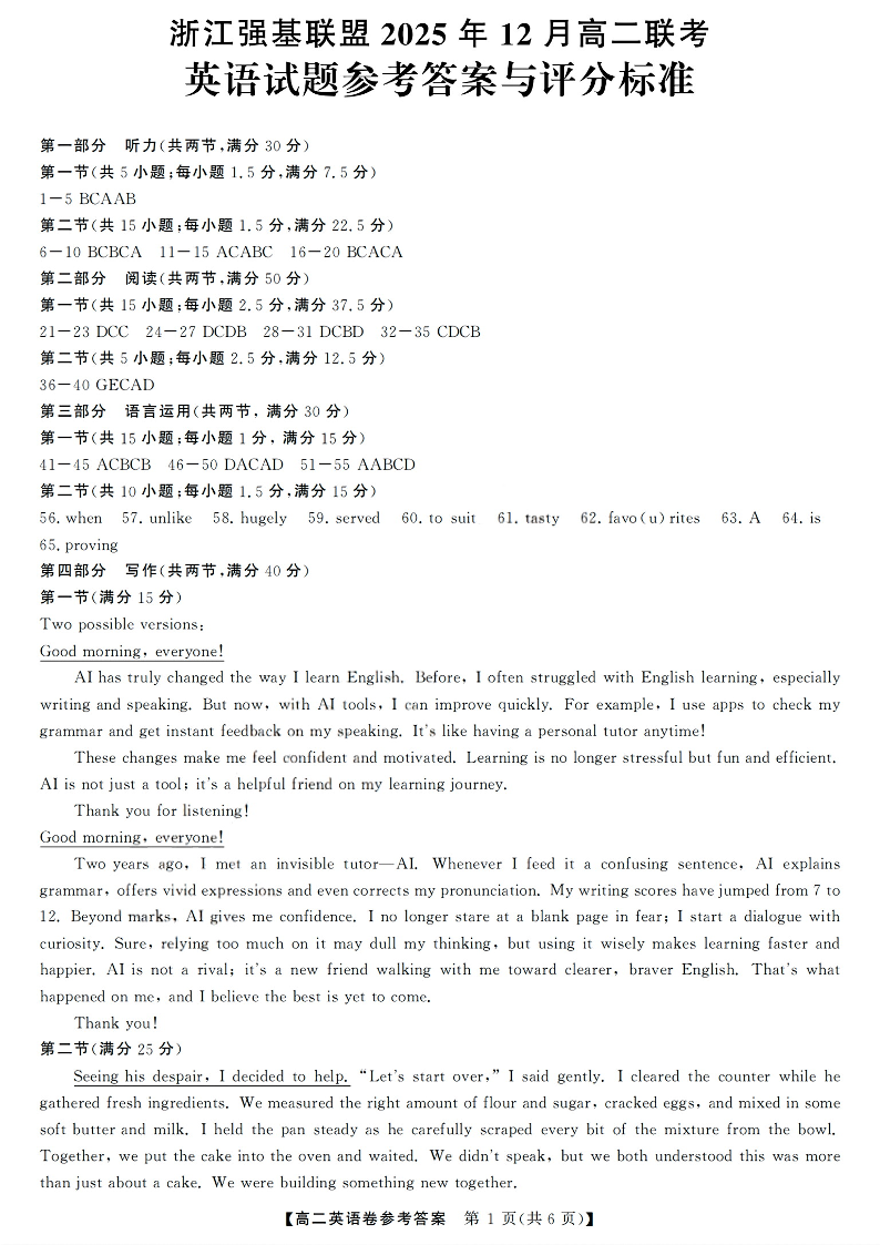 浙江省强基联盟2025年12月高二联考 英语答案.pdf