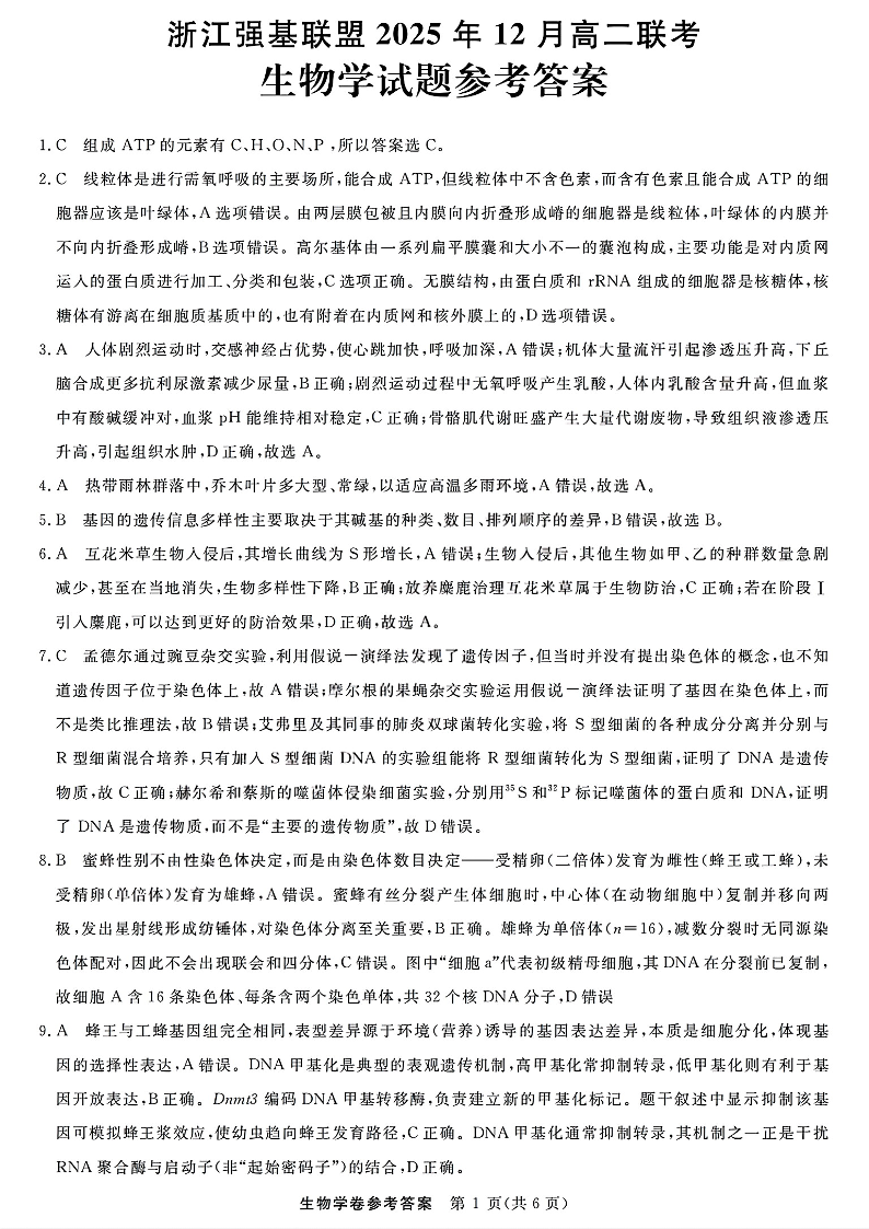 浙江省强基联盟2025年12月高二联考 生物答案.pdf