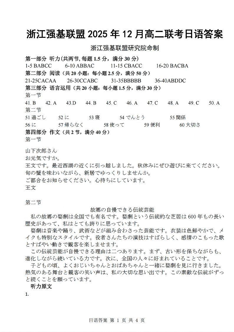 浙江省强基联盟2025年12月高二联考 日语答案.pdf