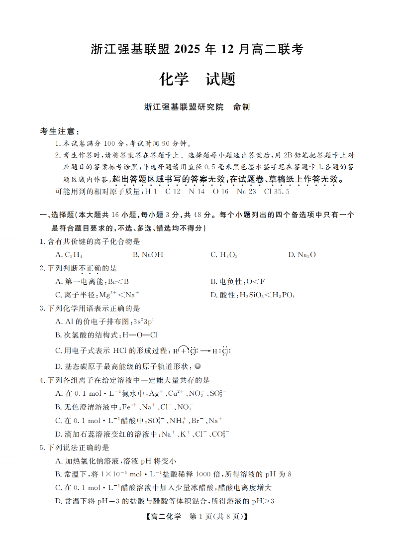 浙江省强基联盟2025年12月高二联考 化学.pdf