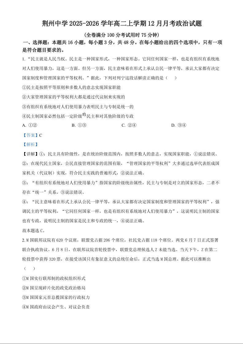 湖北省荆州中学2025-2026学年高二上学期12月月考 政治答案.docx