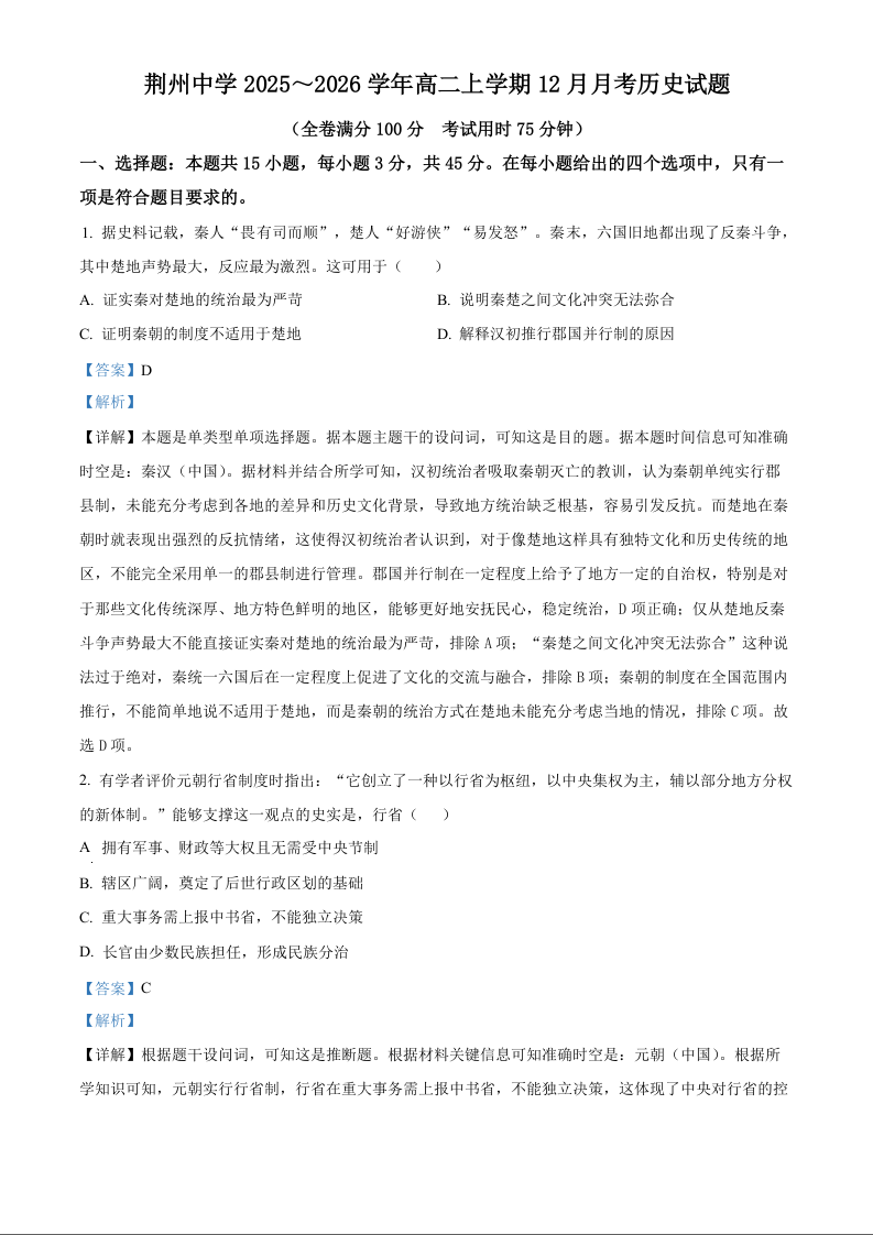 湖北省荆州中学2025-2026学年高二上学期12月月考 历史答案.docx