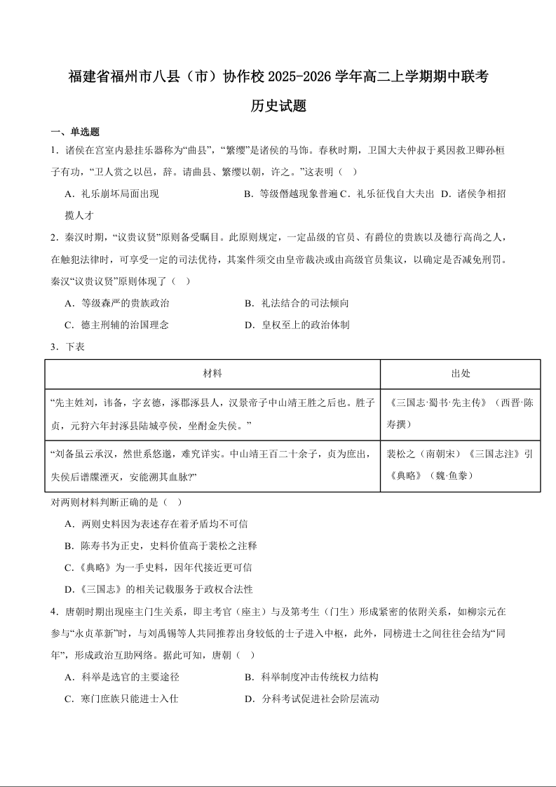 福建省福州市八县(市)协作校2025-2026学年高二上学期期中联考 历史试题(含答案).docx